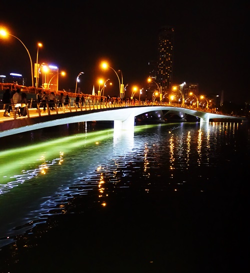 There is a really cool pedestrian bridge over the Singapore River where it enters Marina Bay.
