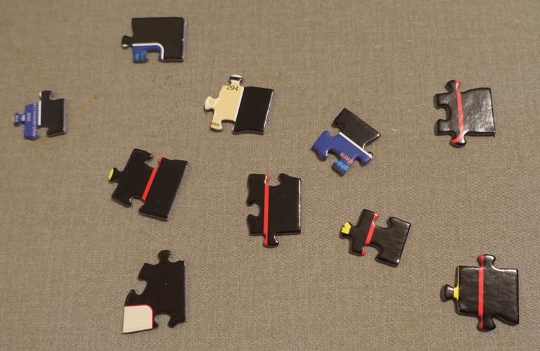 Puzzle edge pieces, First pieces, puzzle piecesHere are some of the first edge pieces that I found. You can see that I found one of the corner pieces. Of course, the first pieces are easy to find, but soon it was taking much longer to find the edge pieces.