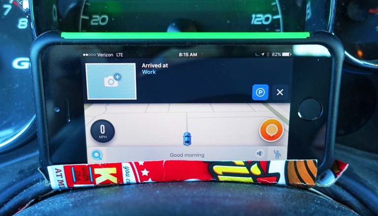 Here you only see about half of the holder. The rest is wedged between the steering column and the dash. It works quite well as the phone is held in place and doesn’t move around. I just get everything set up before I start the car and I am set to go.