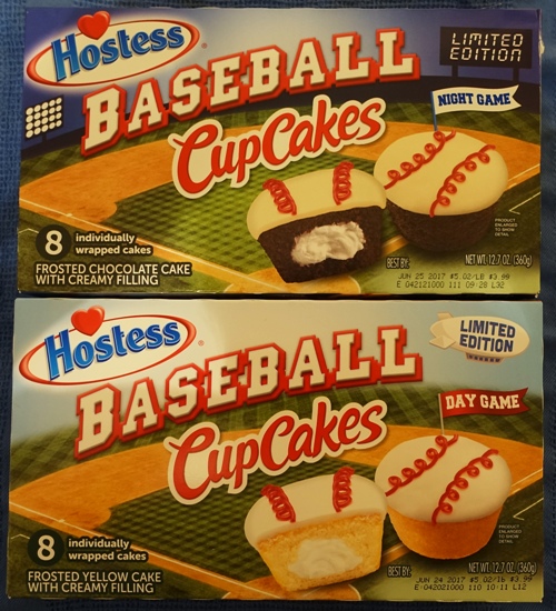 Here the CupCakes are matched with their boxes and you can see that the frosting is darker on the chocolate cake or Night Game CupCake. The frosting is not thick enough to keep the chocolate from showing through.
