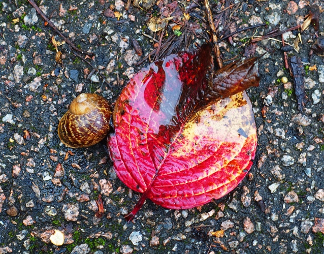 Yesterday the walk to work was a bit wet as it had just finished raining. Along the path I found a snail alongside a beautiful leaf.