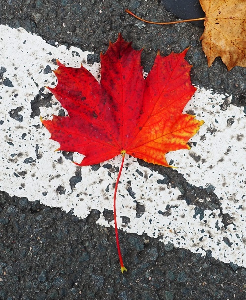 Of course the fallen leaves are also very pretty. I couldn’t resist taking a picture of this red leaf. It is nicely contrasted against the painted white line of the parking lot.