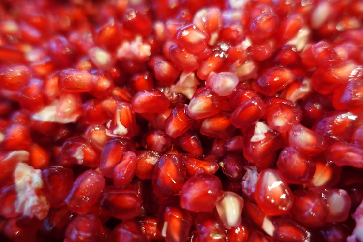 The seeds are really pretty with the fleshy seedcoat or sarcotesta that they are encased with. The pomegranate juice comes from the sarcotesta.