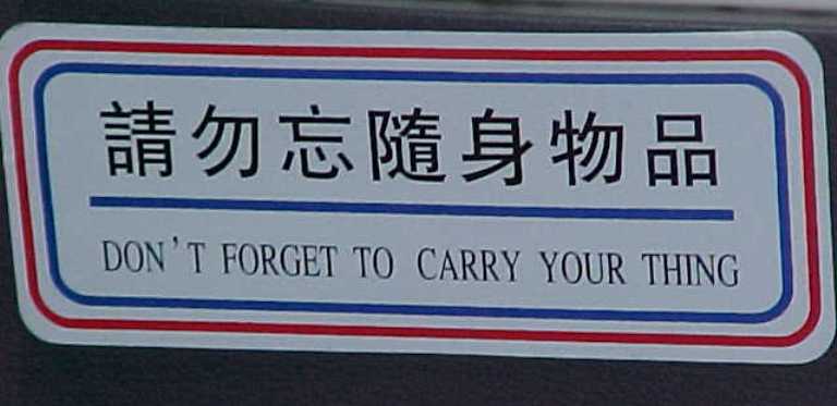 Chinese English, Chinglish, bad translationsI have some good memories of the trip to Shanghai. Every day I would be picked up at my hotel by the company shuttle and taken to the office. I still remember the sign in the shuttle that said “Don’t Forget to Carry Your Thing.” It made me wonder what was the Thing that I needed to remember to carry. Of course, a more accurate translation would be “Don’t Forget your Belongings.”