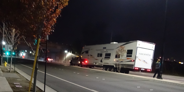 Just near the goats I saw something else interesting. This motor home was slowly being backed down the street. It seem that the clearance on the underpass was not enough. I am not sure where they will have to go to find a greater clearance.