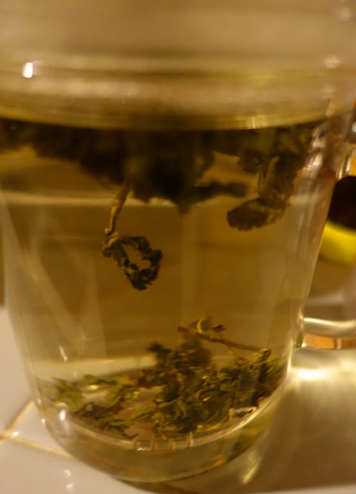 Here are some oolong tea leaves in my small tea cup. This is High Mountain Tea from Taiwan and is very good.