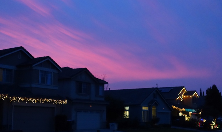 The first two pictures were taken on the way to the mailbox and this one after returning. The sky was already starting to lose color. I decided to capture some of the holiday lights along the street along with the sunset.