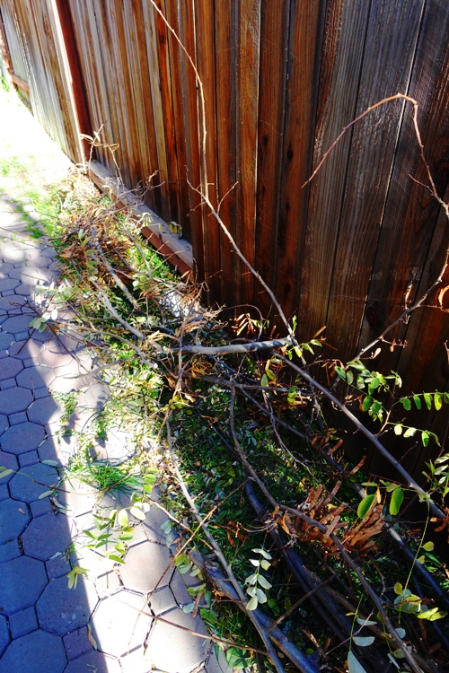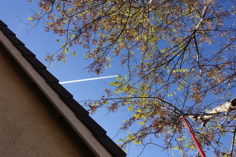 Here I am trimming some of the branches that were in most need of pruning. Unfortunately, I was not able to do all the work I wanted as it was very windy. I only took care of a few of the ones that were closest to the roof and fence. The blowing of the branches in the wind actually showed me which ones were most urgent.