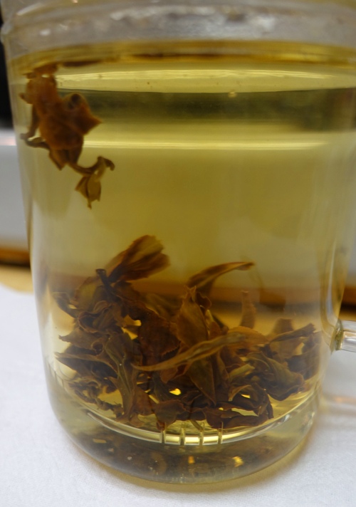 Here you can see the tea leaves starting to open up in the hot water and the changing color as the water is infused with the tea. The brew time for this tea is only two minutes so it didn’t take it too long to infuse.