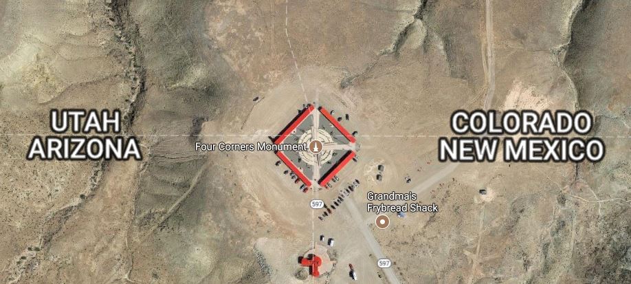 Here you can see that the four states come together at the monument. I think that the map overlay for the state borders is just a bit off as the states intersect in the center of the diamond.