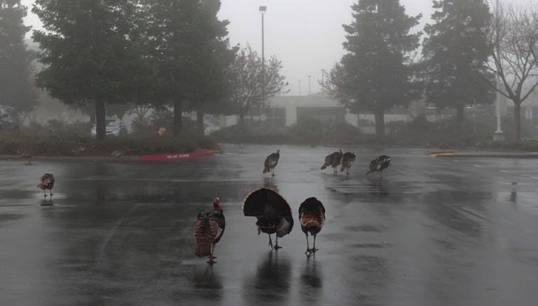 Last Friday when I arrived at the office it was foggy, but the rafter of wild turkeys had gathered in the parking lot behind our building.