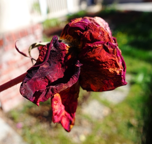 My Mister Lincoln rose bush had a few dried out blooms on it, but just a few days ago had some beautiful big blooms. This rose makes me think of the rose in Beauty and the Beast as it slowly dries out and loses petals.