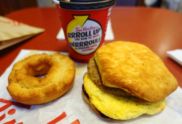 I walked out this morning to Tim Hortons to have my Canadian breakfast. I had a breakfast sandwich along with a sour cream plain donut and hot chocolate.