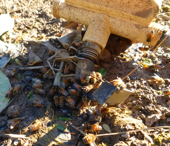Here you can see them around the pipe connection where it has been leaking. They have to sip the water to fill up so it takes them some time to fill up before heading back to the hive.