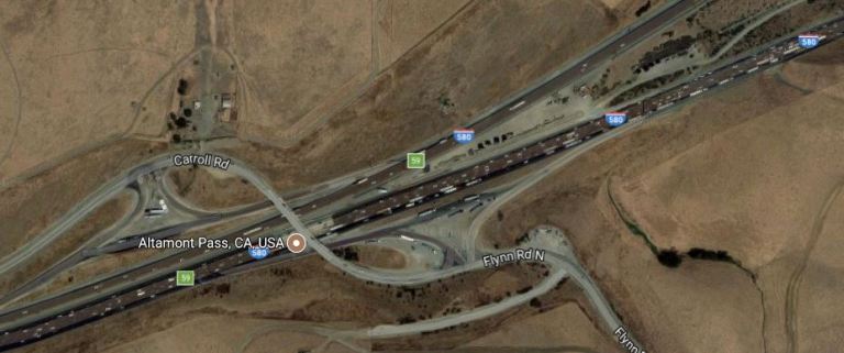 I-580 is packed in the morning through this area and a number of drivers will take the exit ramp (blue x) down to the stop sign at West Grant Line Road (black x). They will then head up the entrance ramp and get back on I-580. I even see big trucks do this.