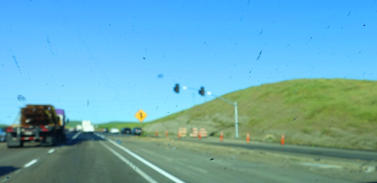 I had my camera sitting in the passenger seat so picked it up, turned it on and snapped a quick picture. It focused on my dirty windshield, but you can see the metering lights above the entrance ramp to I-580 from West Grant Line Road.