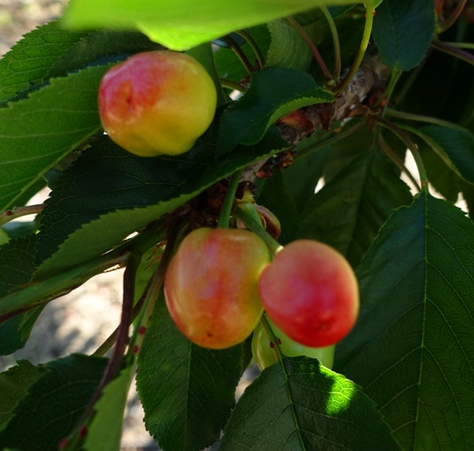 The cherries are starting to ripen and turn red. They are still very hard, but soon they will be a beautiful red and full of juice.