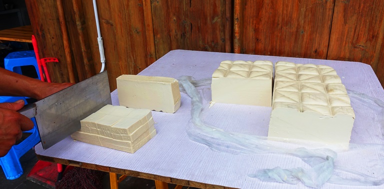 Here are some blocks of tofu being cut into small squares. It was interesting to see the man quickly cut the tofu. Just close by a lady was grilling tofu that probably came from these blocks.