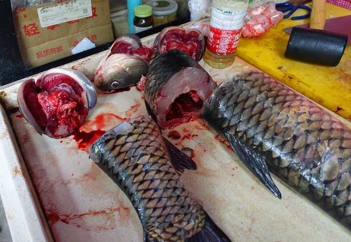 I walked by a little shop that was selling fish and watched the owner do a bit of butchering. Here you can see the bloody fish heads and a section view of the body of the fish.