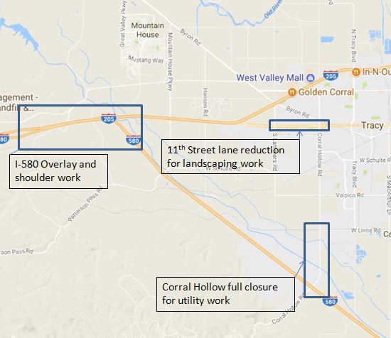 Earlier this year Corral Hollow was closed entirely for utility work to support the Tracy Hills project. See my post Tracy Traffic Troubles for more details. There were many upset people who had to find other routes for their commute.