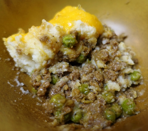 Now for a picture of the cottage pie in the bowl. It looked wonderful and was delicious. The hamburger or mince had a nice complex taste and the creaminess of the mashed potatoes was a nice contrast.