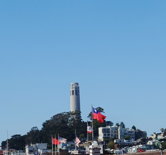 Here is the much shorter and older Coit Tower that was built in 1933. The art deco tower was built using reinforced concrete. In the foreground you see flags flying above Chinatown.