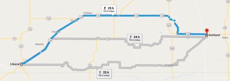 Here you can see the route from the Liberal, Kansas which was the last stop on the Virtual Hike. You can see that I had choices of routes, but I took the northern route. I did this for two reasons. One, I was very familiar with the route along 160 as I had driven it many times and second I wanted to take my Virtual Hike through the Big Basin. The map does not show the exact place where I deviated from 283, but it is an approximation.