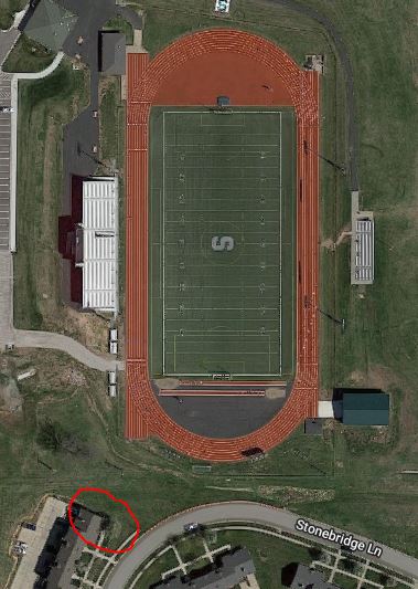 This was the view from in front of my townhouse. This is about what it looked like then. However, the satellite picture shows that they have a new track. Of course, I was always there for track meets as well as I would volunteer and help with timing or recording events.