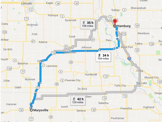You can see that the hike from Marysville was only 104 miles. I passed by a lot of interesting places along the way, especially once I made it to Rock Port where I also had family living near in the 1870’s.
