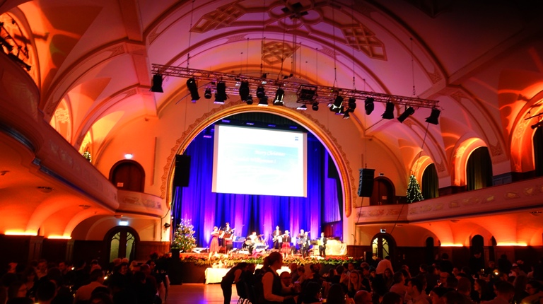 The party was held in the Jena Volkshaus or People’s House. The large hall we were in is used for concerts and other events. It is also the home of the Jeaner Philharmonie orchestra. In this picture you see a small orchestra. This orchestra is composed of company employees. They had a great sound and played a lot of traditional holiday music.