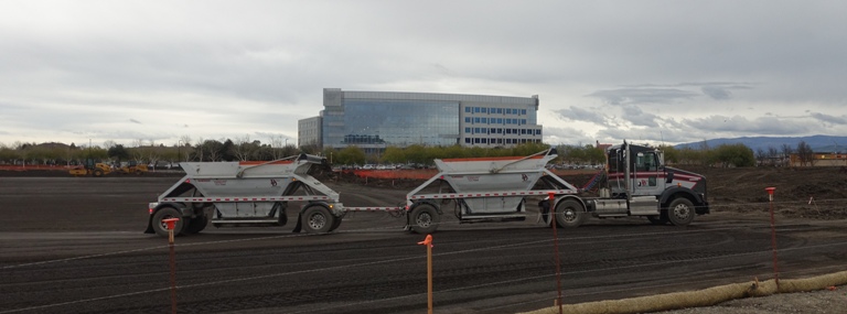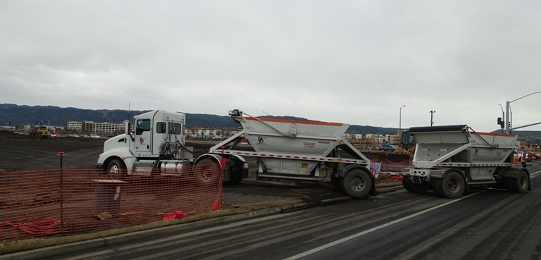 The trucks would go to where the rock was needed and dump the load from the two hoppers.
