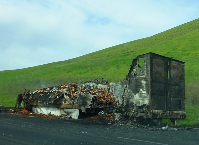 Here you can see the truck that was on fire. The fire had consumed most of the trailer and the contents. I found out that the truck was carrying salami and bacon. I thought about clever titles like “Burnt Bacon Breakfast Commute”, but decided not to use any of them.