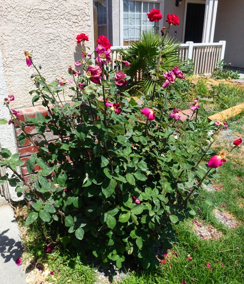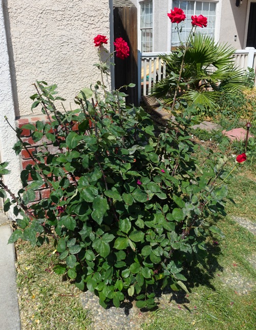 The bush looks a lot different after all the spent blooms have been trimmed away. The rose blooms on this Mr. Lincoln bush do not last long. However, more are on the way and I will probably come home to a bush full of blooms.