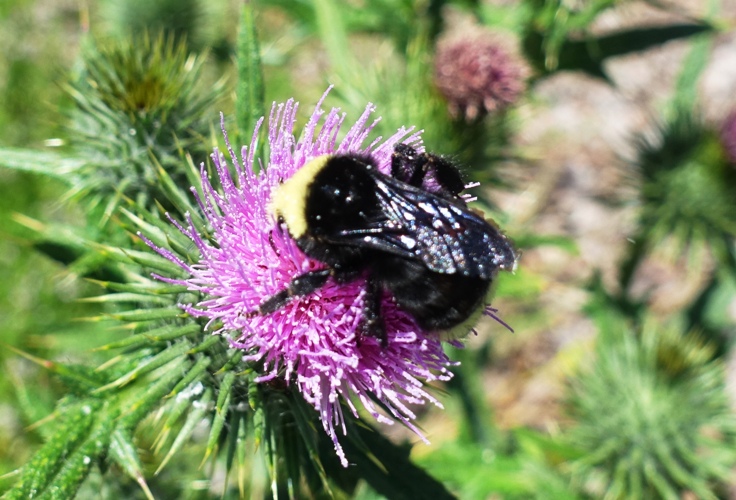 On the way back to the office I saw this patch of thistles and noticed that there was a bee doing a bit of pollination.