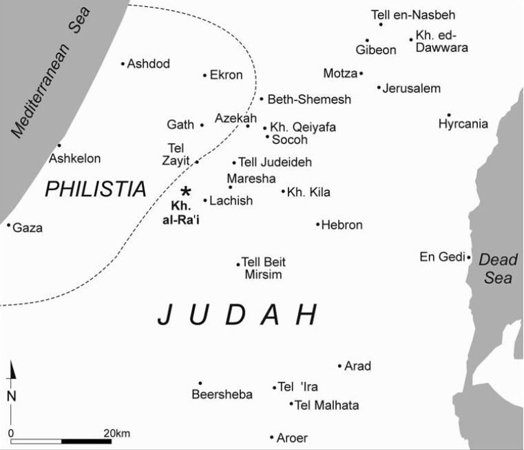 In the map above you can see that Khirbet al-Ra’i is located close to Lachish and is south of the proposed location for Gath. The site is along the border between Judah and Philistia.