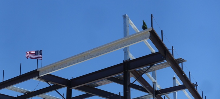 You can also see the traditional flag and tree that are placed on the last beam to signify that the building has been topped out.