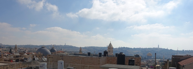 Here is a view from the roof of the hotel. You can see the domes of the Church of the Holy Sepulcher to the left and the golden top of the Dome of the Rock to the right. You can also see the Mount of Olives in the distance.