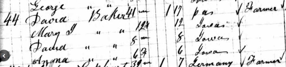 I also found David Baker in an 1868 directory of Doniphan County. He is shown as a shingle-maker. I tried to find the intersection of Wathena and Palermo roads, but the roads must have changed names since then. Palermo was a small town south of Wathena, so perhaps the road leading south out of town was Palermo road. I need to see if I can find a plat map from when David lived there.