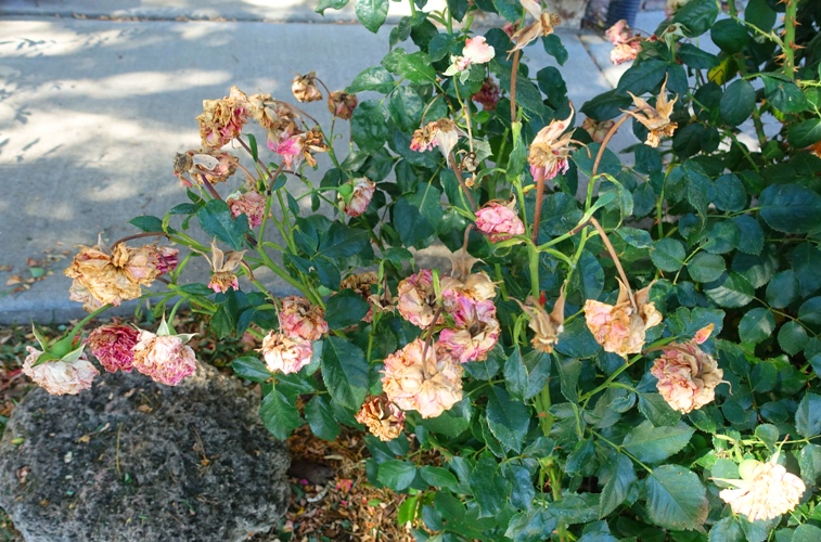 My pink rose bush had many spent blooms and really needed a cleanup.