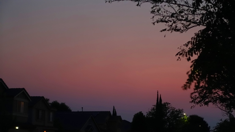 Here we see a sky full of pink, purple and violet color. This means that the sun has dropped below the horizon. The color here is mainly from light reflecting off of smoke in the air.