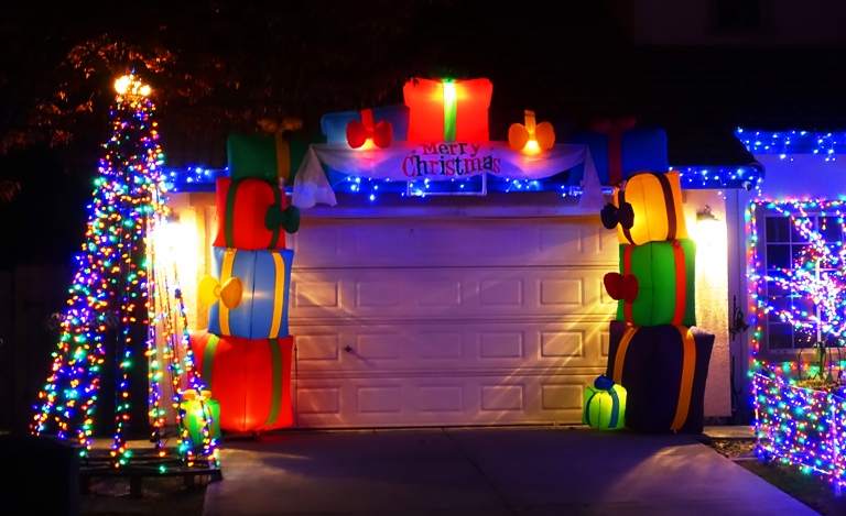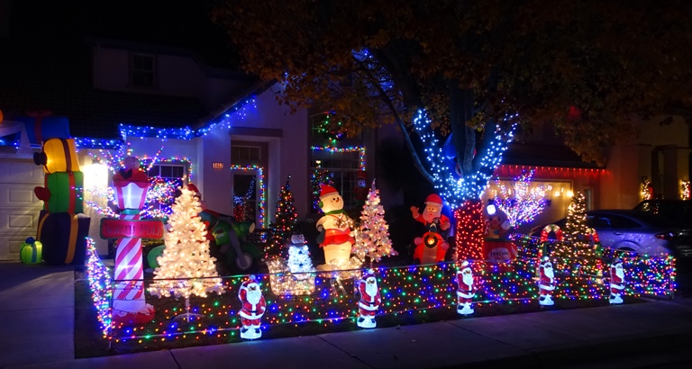 Here you can see that the yard is full of decorations. I really like the row of Santa figures along the little fence.