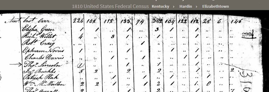 Here is the 1810 Federal Census for Hardin County, Kentucky. You see here Thomas Lincoln listed and in the first column for Males under 10 there is a 1 for Abraham.