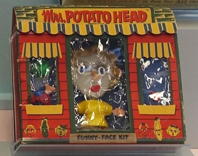 Mr. Potato Head has been in the news recently which is more why I am thinking of this display. This is the original box, and you can see that it did not include the head. You had to supply your own potato or a fruit or vegetable.