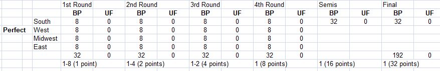 BP (Bracket Points) is probably familiar to most sports fans. When scoring your bracket you get 1 point for a first round win, 2 points for the second round and then 4, 8, 16 and 32 for the following rounds. Basically, you fill out the bracket with the higher seeded team winning each game. You then add up the points based on the tourney results. For the Final Four, the points are given when a #1 seed wins.