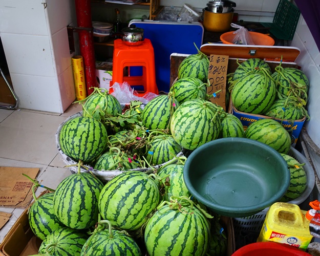 Watermelons with stems, Shanghai Fruit VendorThis picture is also from a trip to Shanghai. I discovered these watermelons in a fruit shop. Notice the long stems that each of them have.