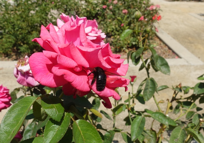 It was easy to keep an eye on her and follow her around the rose garden as the valley carpenter bee is the largest bee in California and can be as large as an inch in length.