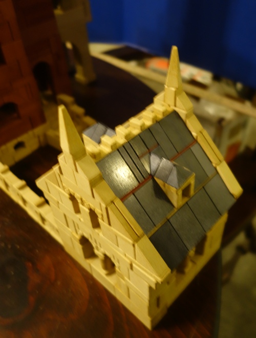 The roof of the building was quite complex and used almost all of the larger roof stones. There is a way that I have found to minimize the red showing through on the roof, but I didn’t use the blue pieces of paper I sometime use on this build.