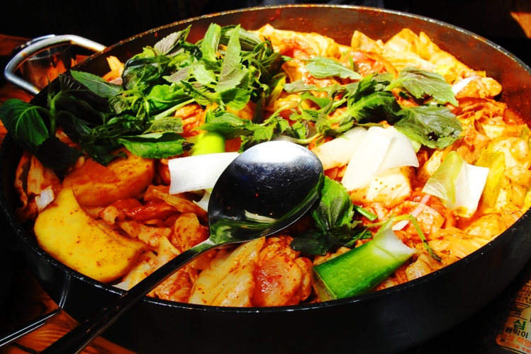 This wonderful dish is called dak galbi and the meal starts by cooking down all these ingredients. Later after most of the meal is eaten, rice is added to soak up all the sauce and little bits of meat and vegetables. See: A Little Seoul Food