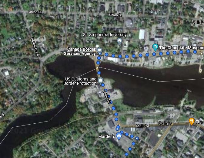 The route crossed the border by crossing the St. Croix River at Saint Stephen, New Brunswick. This is where Samuel de Champlain spent the winter of 1604.
