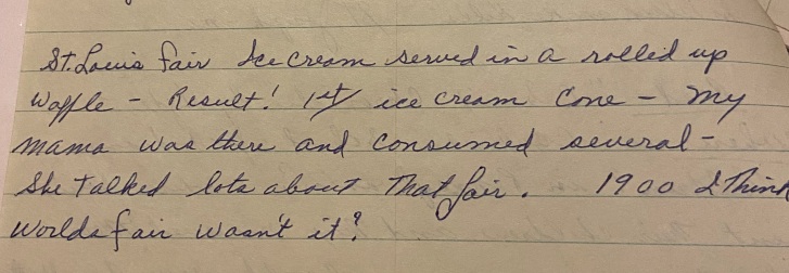 My family has been eating ice cream cones for well over a century now. My great grandmother Lottie Grace Cochran was at the St. Louis World’s Fair and consumed several ice cream cones when she was only 14 years old.
